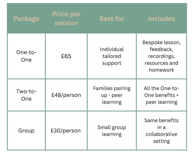 For families wishing to pair up with another family, 2-to-1 tuition is available at £48 per person per session, which includes: