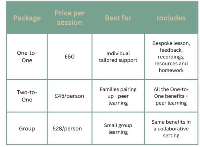 For families wishing to pair up with another family, 2-to-1 tuition is available at £45 per person per session, which includes: